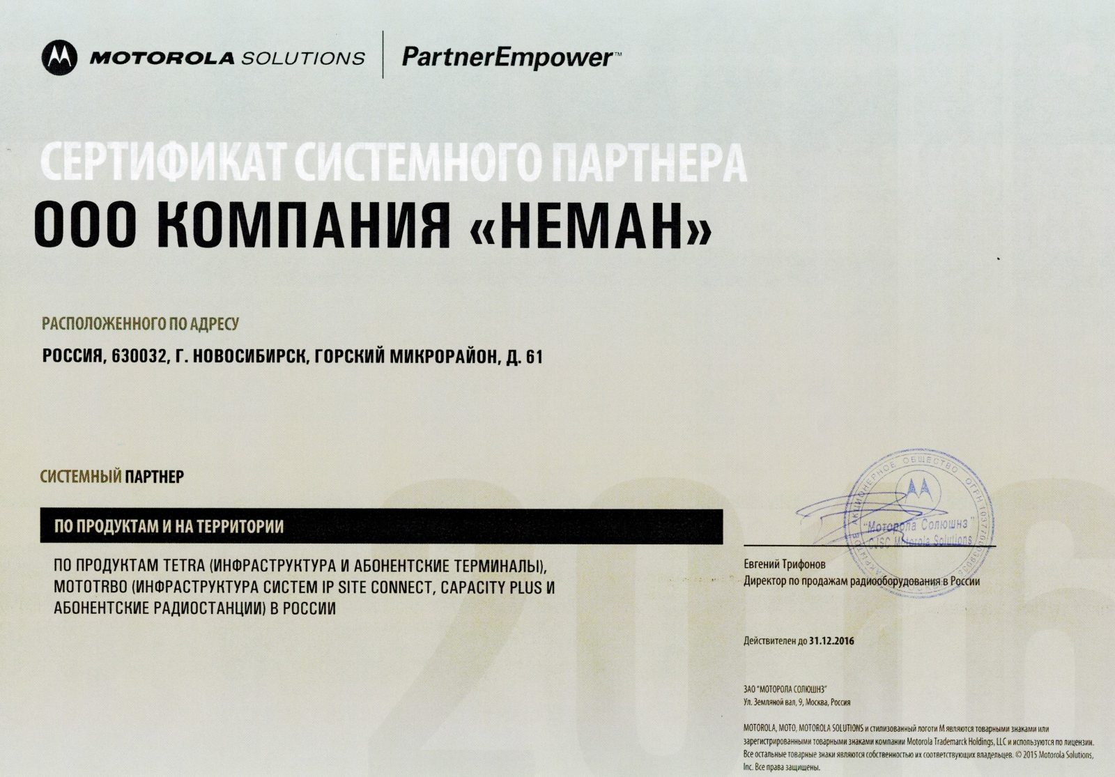 Полученный статус Системного Партнера по продуктам и решениям TETRA (инфраструктура и абонентские терминалы) и MOTOTRBO (сетевая инфраструктура IP SITE CONNECT, CAPACITY PLUS, LINCED CAPACITY PLUS и абонентские радиостанции) в России, в очередной раз подтверждает наши компетенции по части разработки и реализации проектов в области профессиональных систем радиосвязи на базе решений компании Motorola Solutions.