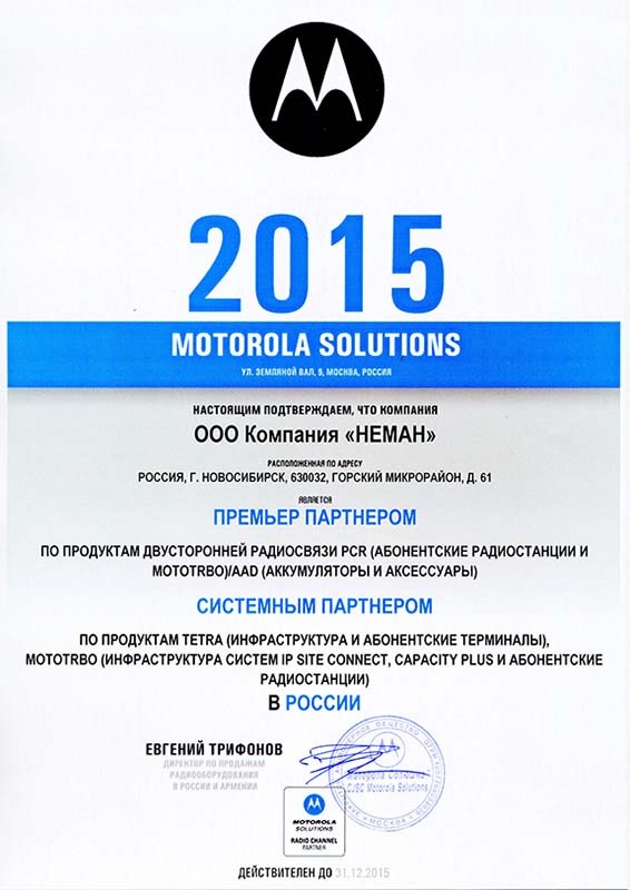Вместе с этим, по итогам работы за 2014 год Компании “НЕМАН” присвоен статус Премьер Партнера по продуктам двусторонней радиосвязи PCR (абонентские радиостанции и MOTOTRBO)/ADD (аккумуляторы и аксессуары). Это позволит нам более гибко строить ценовую политику со своими партнерами и постоянными клиентами, а также повысит конкурентоспособность наших предложений по продукции Компании Motorola Solutions.