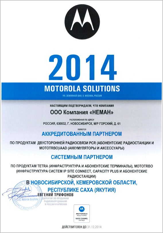 В результате ежегодной аккредитации Партнеров «Motorola Solutions» в России «Компания «НЕМАН» получила сертификат, подтверждающий статус АККРЕДИТОВАННОГО ПАРТНЕРА по продуктам двусторонней радиосвязи PCR (абонентские радиостанции и MOTOTRBO) / AAD (аккумуляторы и аксессуары) и СИСТЕМНОГО ПАРТНЕРА по продуктам TETRA (инфраструктура и абонентские терминалы), MOTOTRBO (инфраструктура систем IP SITE CONNECT, CAPACITY PLUS и абонентские радиостанции) на территории Новосибирской и Кемеровской областей, Республики САХА (Якутия). Компания «НЕМАН» имеет статус Партнера компании «Motorola» с 2001 г.