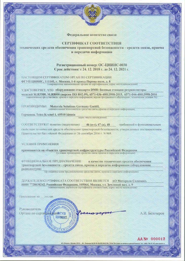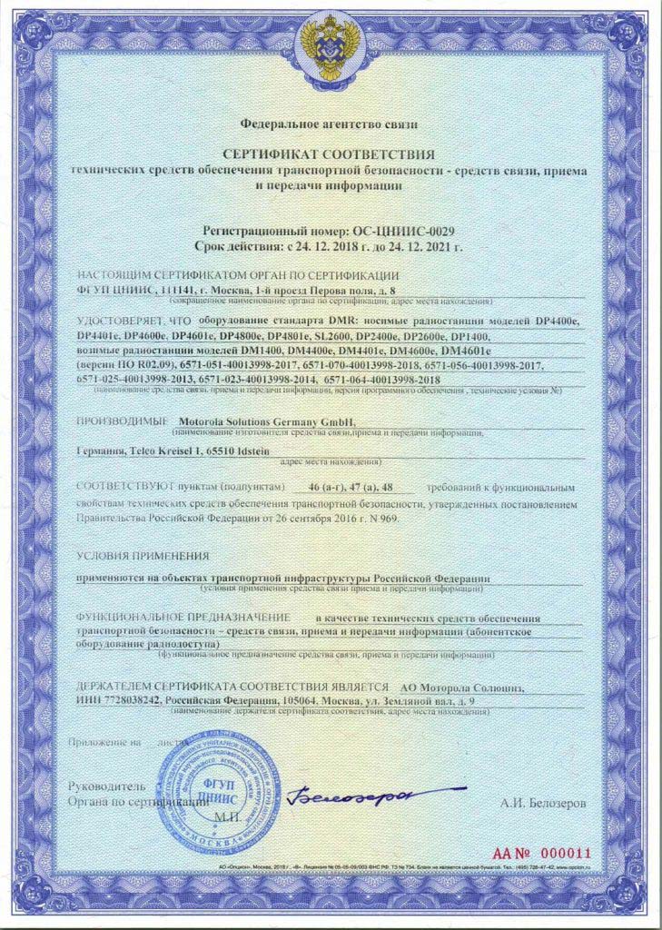 Сертификация была произведена согласно требованиям Федерального закона «О транспортной безопасности» №16-ФЗ от 09.02.2007 г. и Постановлению Правительства РФ №969 от 26.09.2016 г. Разрешительные документы выданы Федеральным агентством связи и позволяют официально использовать радиооборудование Motorola для построения сетей связи в аэропортах, метрополитенах, морских портах, транспортных терминалах, а так же на других объектах транспортной инфраструктуры на территории России, где вопросам транспортной безопасности уделяется особое внимание.